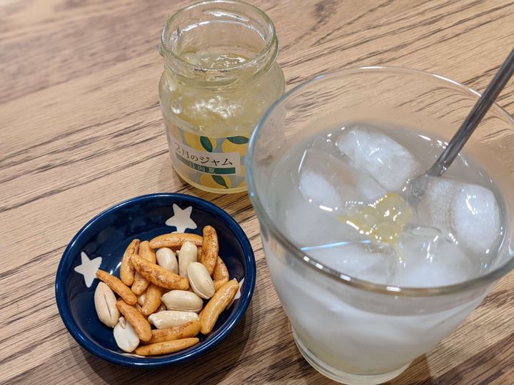 焼酎に、日向夏ジャムを適量おとして炭酸で割る。