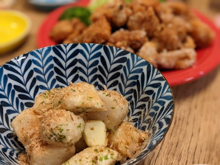 油でいい色になるまで揚げたら、塩を振って青のりと鰹節をまぶして出来上がり。