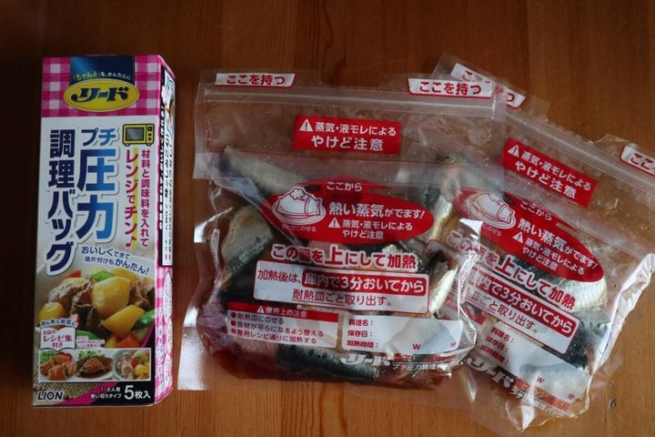 3.1枚の圧力レンジバックに1の合わせ調味料を半量、いわしを3尾分、生姜スライス2枚梅1粒分を入れてジップします。同様にもう1セット作ります。