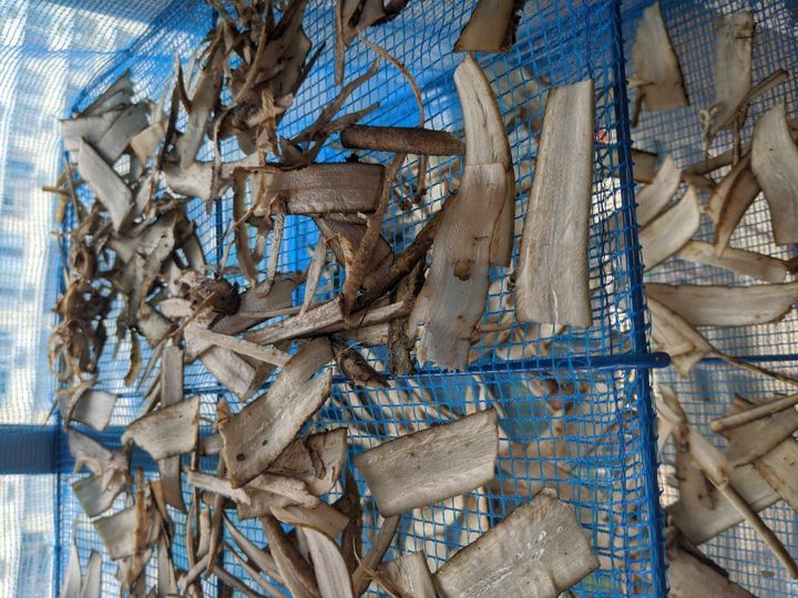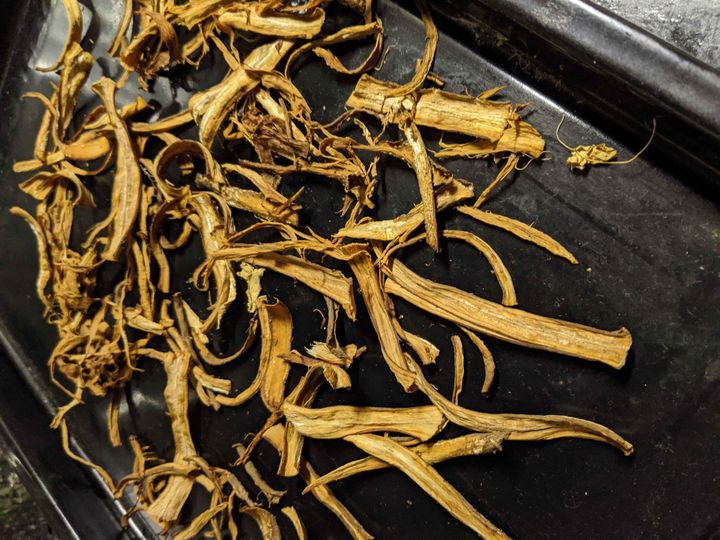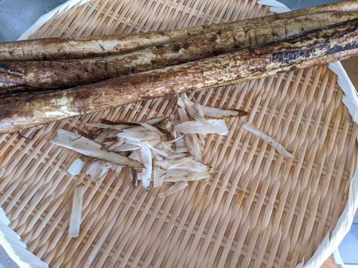 材料はごぼうだけというごぼう茶。シンプルです。泥を落としたごぼうをスライスして干し、煎るだけでできるらしい。干し網もある事だし、という事で満を持して挑戦です。