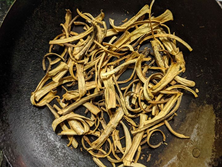 天候が悪かったのですが、2日干してカラッとしました。これを焦げる寸前まで煎ります。油無しのフライパンで丁寧にジリジリと……。