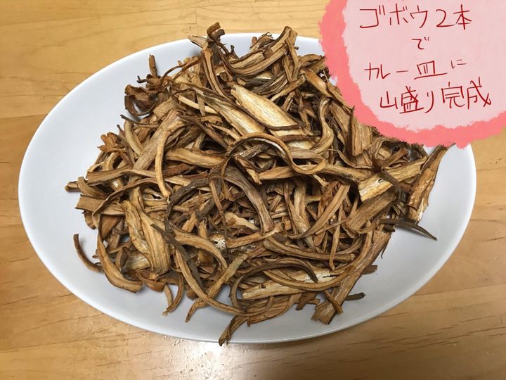 130円の国産ごぼうを2本準備しました。皮に栄養があるので、軽く擦って泥を落とす程度にします。ていねいな暮らしに憧れて包丁でささがきにしようと思いましたが、すぐ疲れてピーラーを使用。薄くスライスした方が乾きやすくて良いです。