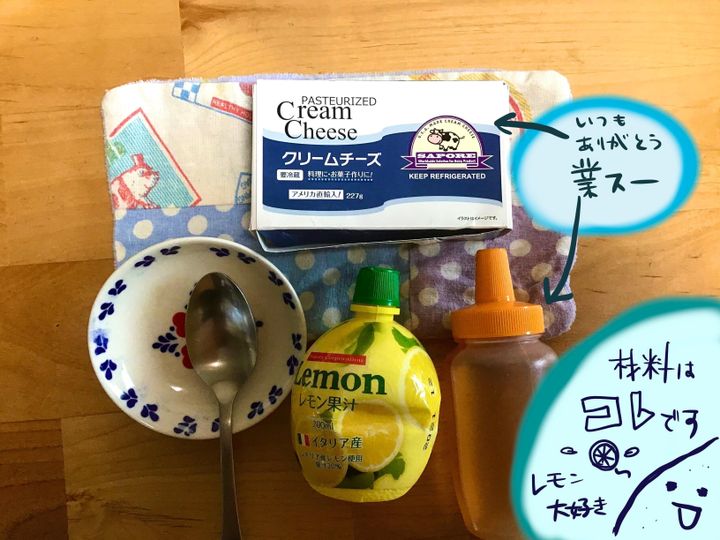 しかしおやつにクリームチーズパンを食べると主にカロリー面におきまして諸々不都合がある場合もございますので、ここはパンを除外してスプーンにクリームチーズをすくいます。で、レモン汁を数滴、はちみつをお好みの量垂らします。