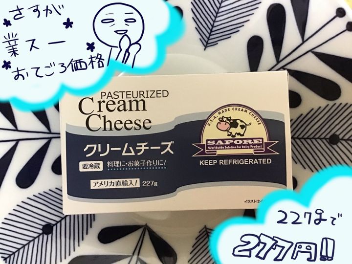 業務スーパーのクリームチーズはかなり柔らかくてクリーミーです。「料理やお菓子作りに」とありますが、もってりとパンに塗るのも美味しいですよ。