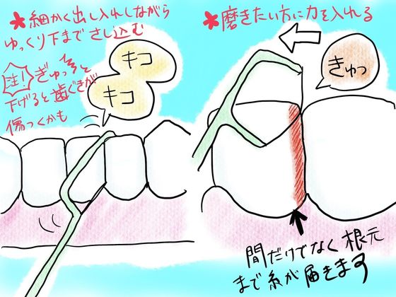 フロスも糸ようじも細い糸を使用しているので、使い方にはちょっと注意が必要です。