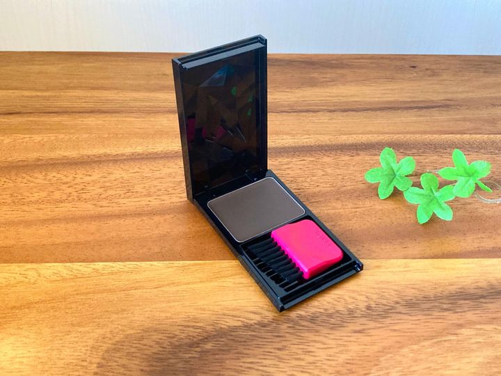 手のひらにのる大きさで厚みが1cmしかないので化粧ポーチにすっぽり入ります。外出先で思いがけず白髪を見つけてしまっても化粧直し感覚でカバーできるのはありがたいですね。そしてケースのデザインがシンプルで何につかうものか謎めいた雰囲気があるのも白髪を気にするかたにはうれしいと思いますよ。