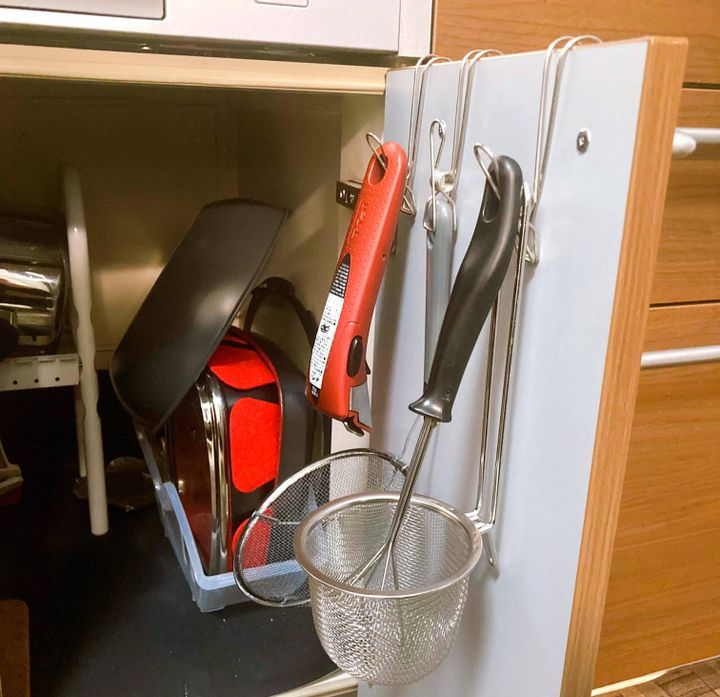 扉に引っ掛け収納することで、みそこしのためにあえて場所を作らずにしまえるようになりました。
