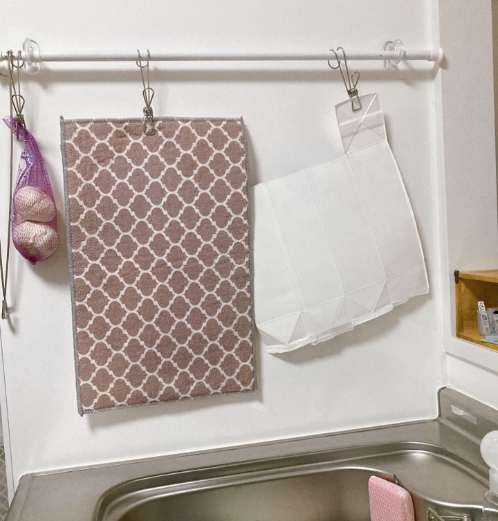 わが家のシンクは横が壁になっているのでそこに突っ張り棒をつけて、引っ掛けスペースを作りました。