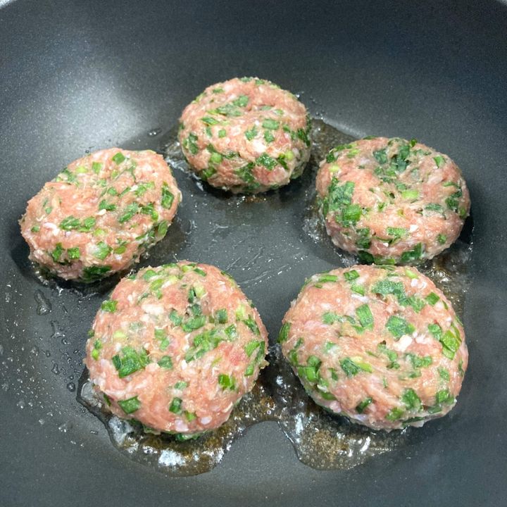 フライパンに油を熱し、3のハンバーグを並べて焼きます。(中火)