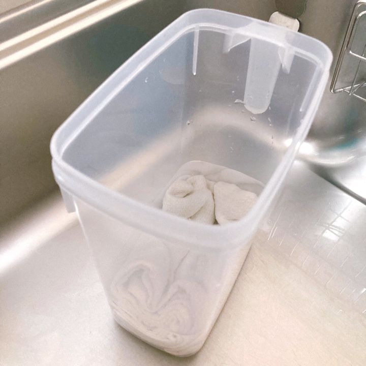 冷水筒に入る大きさに折りたたんで漂白剤を溶かした水に浸けておくだけですが、これまでと同様に水の量は少なくて済むのとシンク内に置いていても邪魔にならないのが気に入っています。