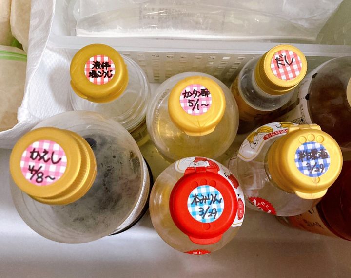 そこで、シールに調味料の名前を書いて貼るだけでわかりやすくなり、剝がれたり消えることもないのでスッキリしました!!
