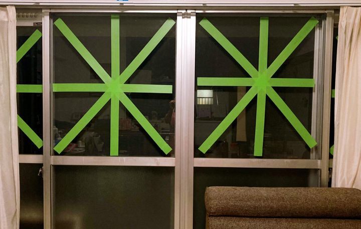 その飛来物で窓ガラスが割れるのを防ぐために、全部の窓に養生テープを張りました。