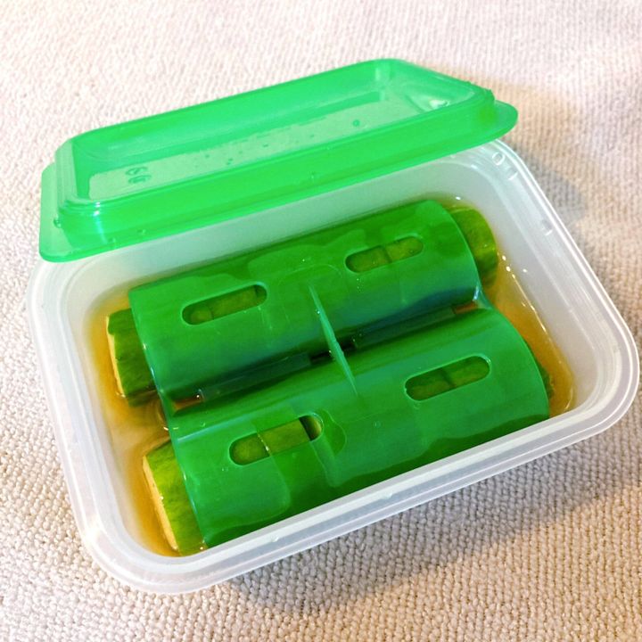 容器にくぼみがあり、そこに入る大きさに切ったきゅうりを入れるのが特徴なんです。その大きさが一口大なので漬けあがったらそのまま食べられ、その大きさが漬け込み時間を短くしてくれています。