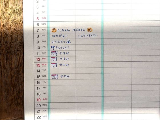 このカレンダーに幼稚園の内容もひらがなで記入して、身支度と併用して使う予定です!
