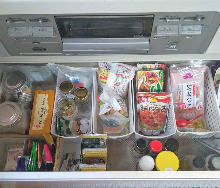 など、いいことづくめです。我が家ではコンロ下にストック食材を収納しています。インスタントスープやスティックコーヒー、調味料などいろいろ入っていますが、ここだけと決めているので、なくなるものがすぐわかります。