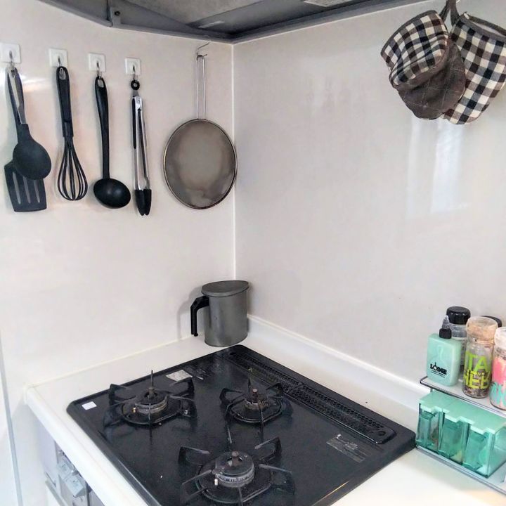 しかし、実際に料理を作ってみると、出したりしまったりの作業が多くて、よく使うおたまや菜箸、フライ返しや調味料類が手に届く距離にないことが不便でした。