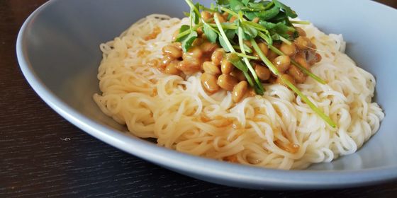 そうめんに納豆、豆苗をのせて、にんにく旨タレだけでお昼ご飯ができちゃいました。