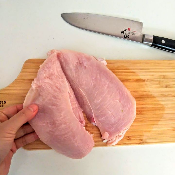 これは以前TV番組で観たのですが、鶏ムネ肉にスライドするように横に包丁をいれて、半分にカットします。