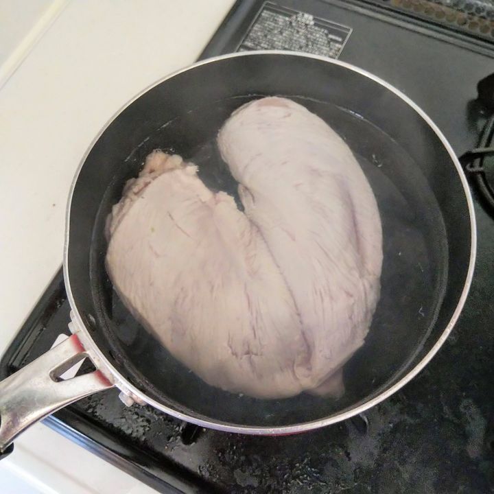 1 お鍋にお水、お塩、お酒を入れて沸騰させる(鶏ムネ肉がしっかりかぶるくらいの水量)