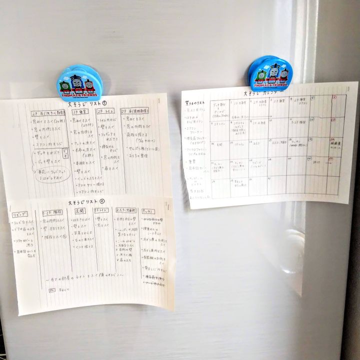 筆者はカレンダーと掃除リストを冷蔵庫に貼っています。