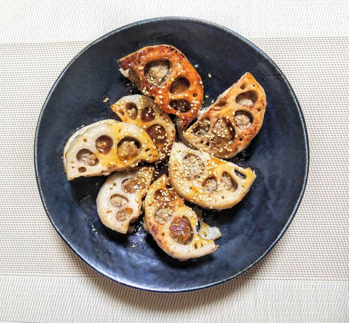 トッピングに焼いたレンコンをのせるとさらにレンコンがおいしく楽しめます。