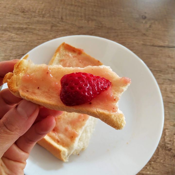苺バターのほどよい甘さと、フレッシュなイチゴの酸味が絶妙!他のフルーツも相性良さそうです。パンに塗るだけではなく、デザート作りにも活用できそうなので、使い方によってはマルチに活躍できるなバターかもしれません。