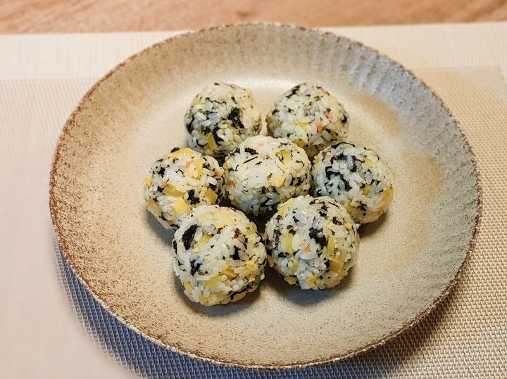 ごはんとチュモッパの素とごま油をボウルにいれて混ぜて、一口大に握って盛り付け。野菜と海苔が入っているので、食感もざくざくで楽しそう!