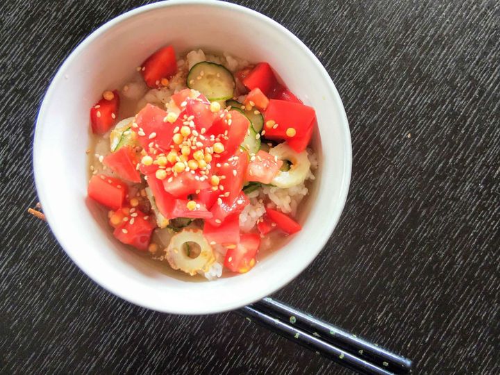 ③温かいご飯の上に②をかけ、ごま・あられを仕上げにかけてできあがり!