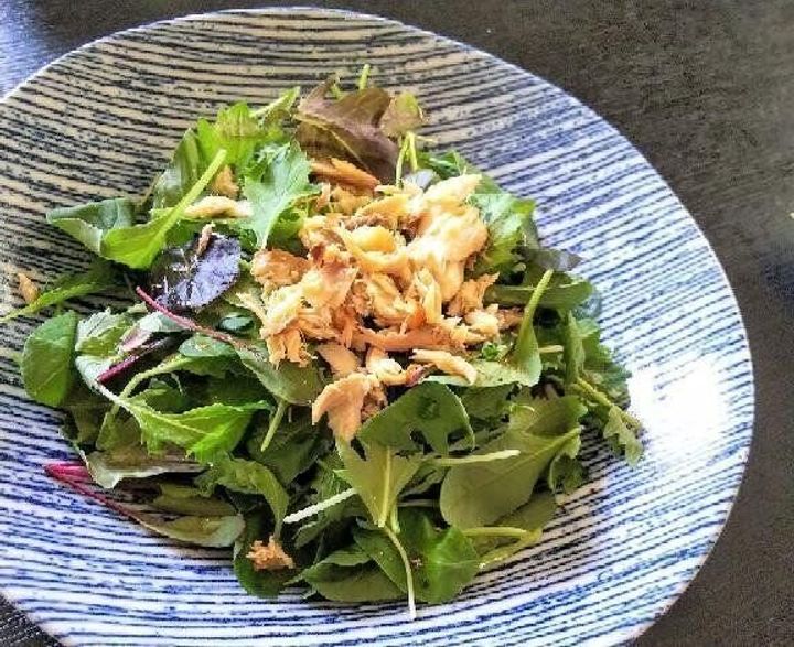 ベビーリーフに鯖をのせて、オリーブオイルとハーブ塩をかけるだけのシンプルなサラダ。
