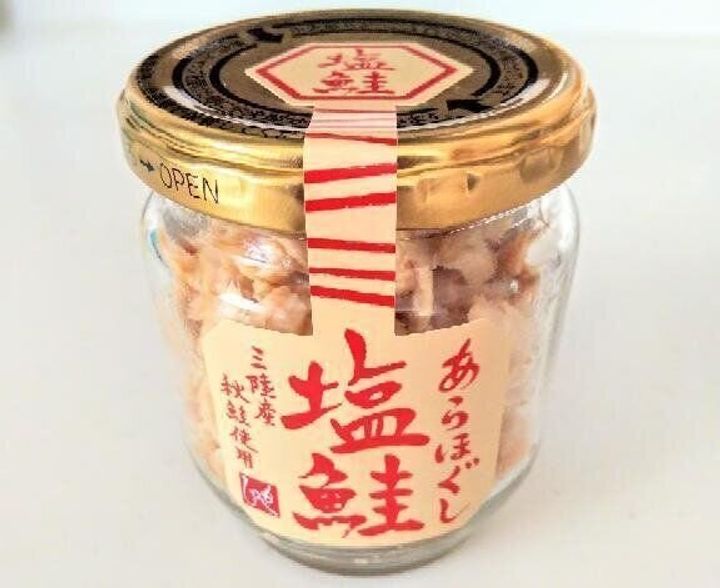 次はカルディ「あらほぐし塩鮭 80g」486円です。上記の鯖同様、瓶に入ったあらほぐしの鮭は食べ応えありの大きさで、ほどよい塩気がクセになる一品です。