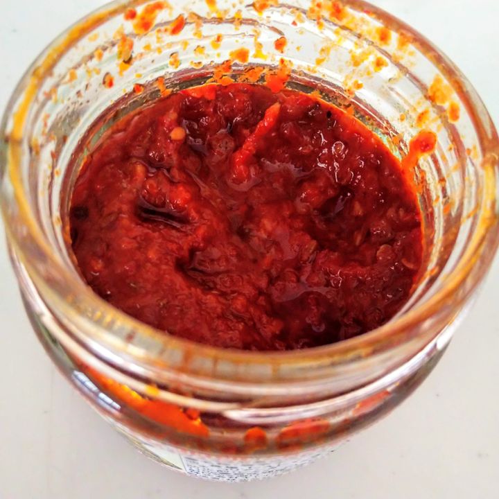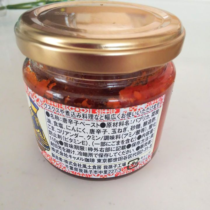 名称は唐辛子ペースト。原材料には唐辛子、玉ねぎ、パプリカ、にんにく、コリアンダー、クミンなどが入っています。唐辛子ペーストというほど辛くはありません。