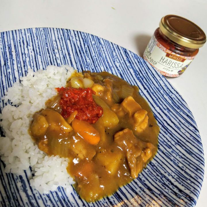 我が家は子供のために甘口のカレーを使用しています。大人は自分で唐辛子や一味をかけて辛さ調節していますが、ハリッサをのせてみました。