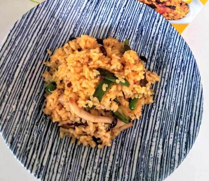 パッケージ通りにお水を少なめにして炊飯し、炊けた後にパエリアの素を入れて5分ほど蒸らしました。