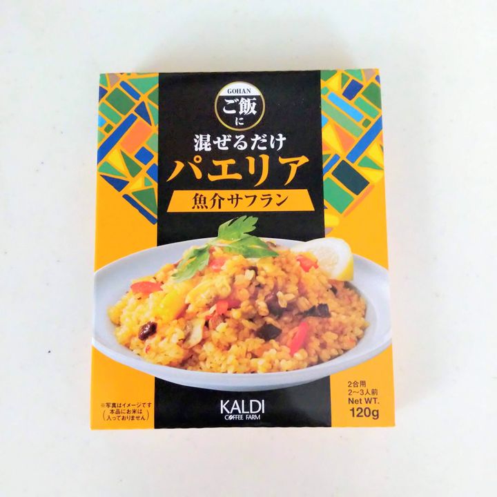 カルディ 混ぜるだけパエリア 魚介サフラン(2〜3人前)298円(税込)です。