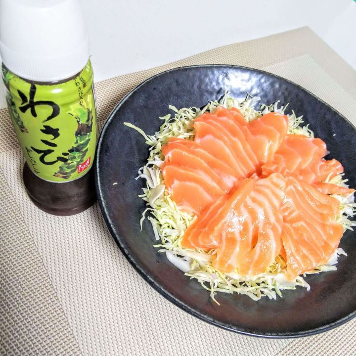 千切りキャベツの上にサーモンをカットしてドレッシングをかけるだけ!