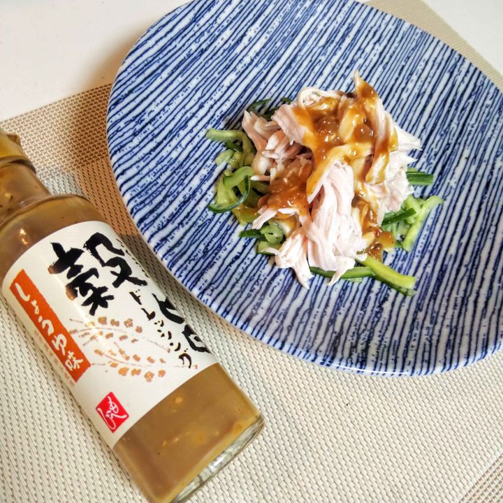 サラダチキンときゅうりを細切りにして、上からかけるだけで出来上がり!時短の一品としても優秀です。