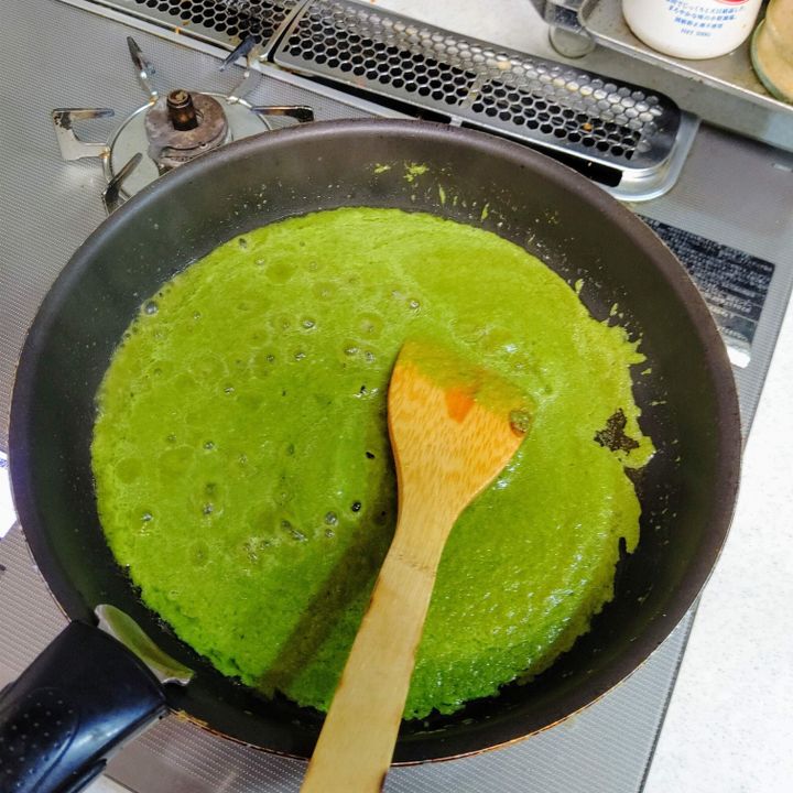 ③フライパンに油をひいて、グリーンペーストを中火で炒め、
