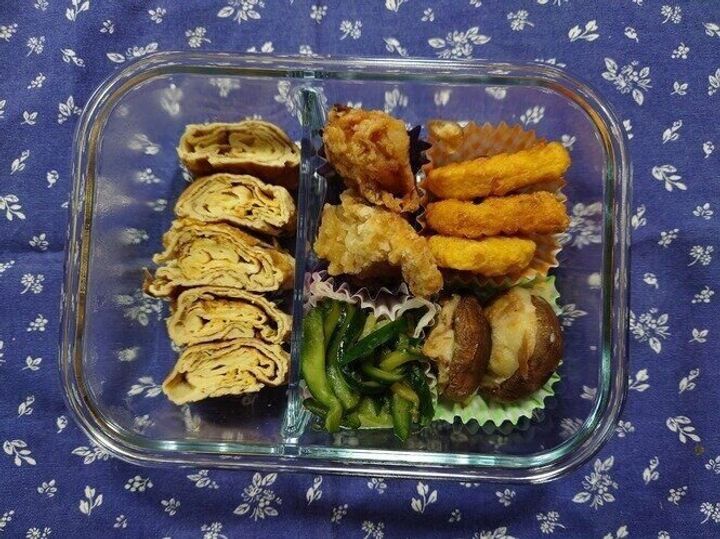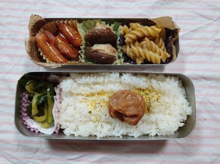 この日は、お昼ご飯を一人で食べるので自分用にもお弁当を作りました。冷蔵庫のあまりものを詰め込んだだけですけど…。