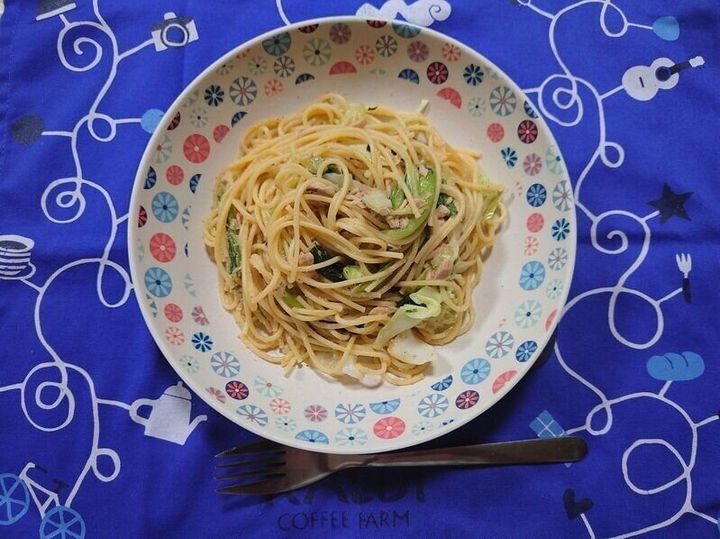 キャベツと冷凍の青梗菜を炒めて、火が通ったら茹でたパスタとツナを入れて麺つゆとゴマ油で味付けをしました。
