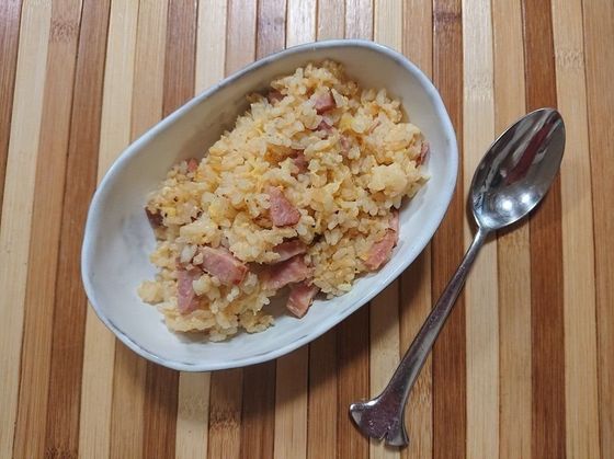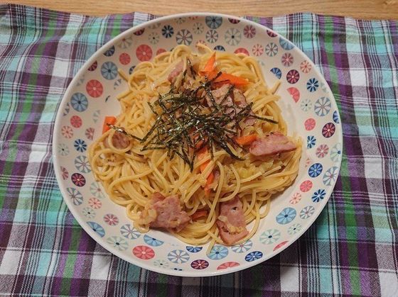 白菜とにんじん・ハムを炒めて茹でたパスタを絡め、めんつゆと塩コショウで味付けしました。