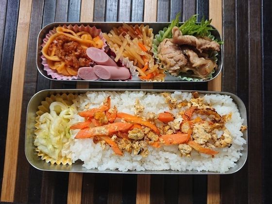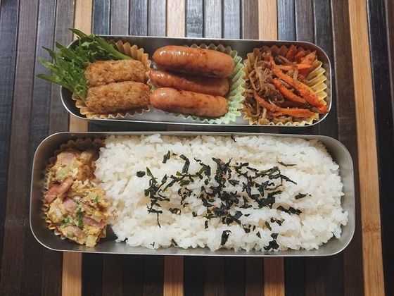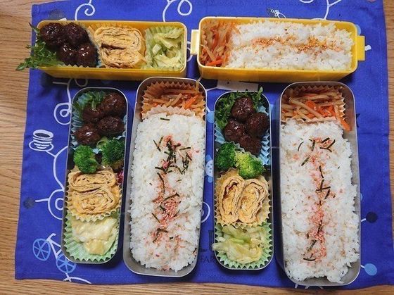 留守番の三人にお弁当を作りました。時間がなかったのでとりあえず詰めただけお弁当(汗)