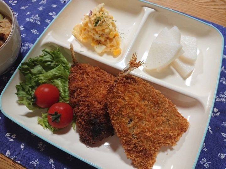 普段私がインスタなどにアップしている夕飯の写真は、主人用です。子供たちにはこんな感じでランチプレートに入れてご飯を出しています。