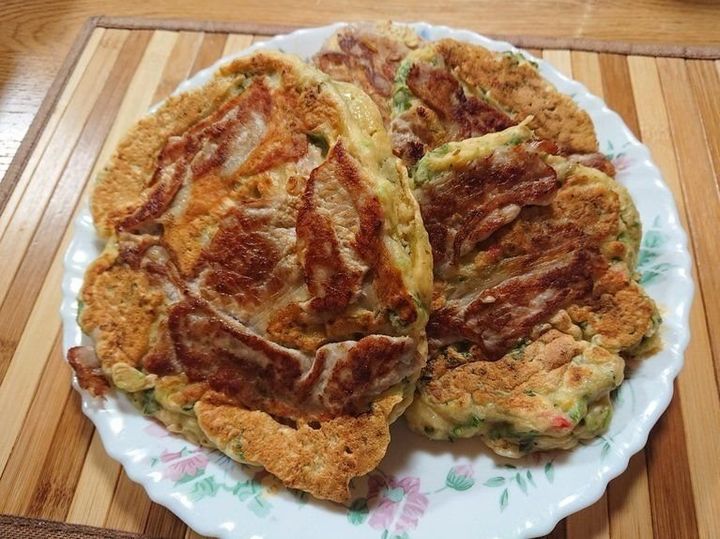 お好み焼きの中に、フードプロセッサーで細かく刻んだキャベツの芯と大根の皮が入っています。キャベツの芯は粗く刻むと食感が気になるのでフードプロセッサーを使ってかなり細かくします。かさましにもなるので食費節約にもなると思います。