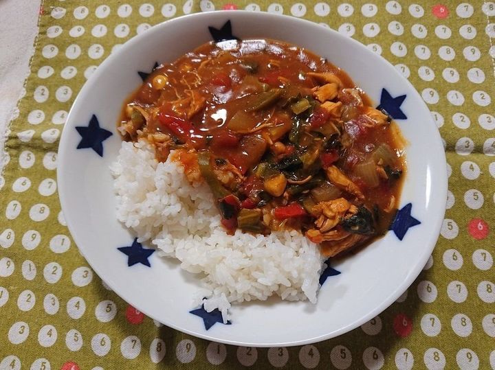 野菜も残り野菜を使っているのですが、実はこのカレー…手作りサラダチキンを使って作ってます。その時の煮汁も入れました。