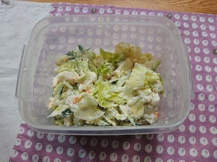 業務スーパーのポテトサラダ(1kg)にレタスときゅうりとカニカマを入れてマヨネーズで和えたもの