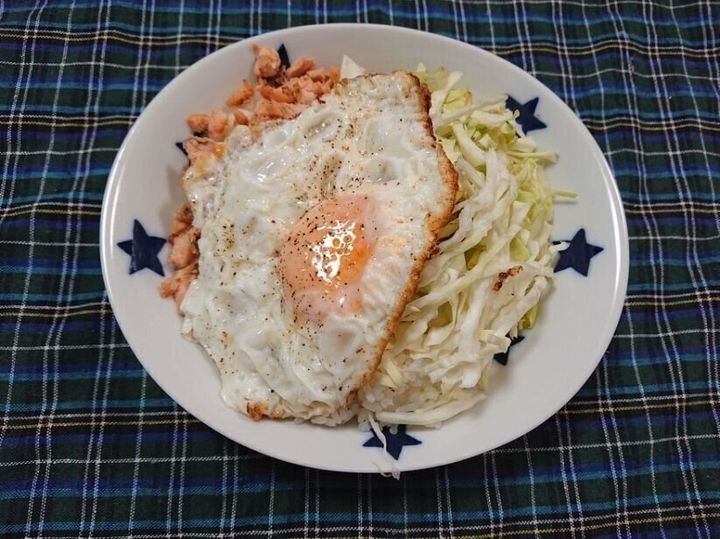 鮭そぼろとキャベツをのせて目玉焼きをのせれば完成です。