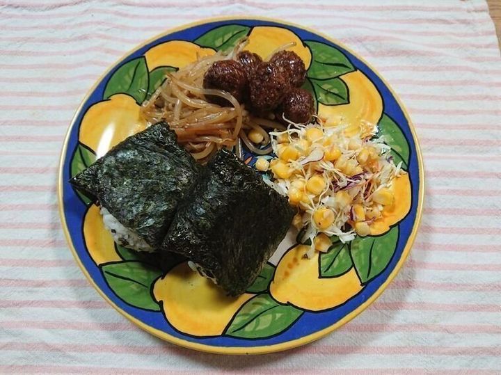 お弁当で余った混ぜご飯をおにぎりにして、お弁当の残りをのせるだけのワンプレートの時もあります。
