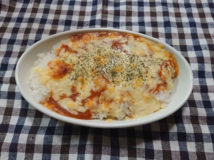 ミラノ風ドリアはごはんにそのままソースをかけてチーズをかけてトースターで5分焼きました。