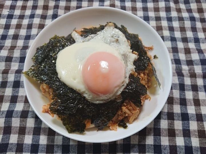 冷蔵庫にあった野菜+ハムを適当にみじん切りにしてごはんと炒めてキムチと醤油と少々のウエイパーで味付けをします。韓国のりをたっぷりと半熟目玉焼きをのせれば出来上がりです。