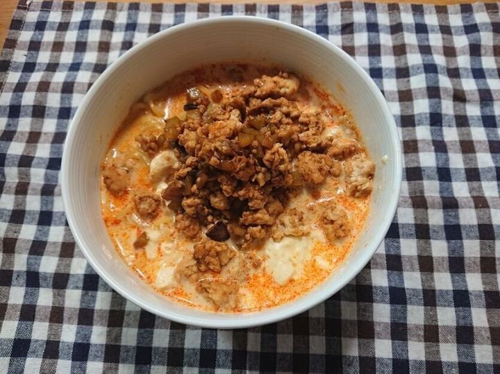 息子がバイト帰りに買ってきてくれたレンチンでできる麻婆豆腐をリメイクして作ったタンタンメンです。